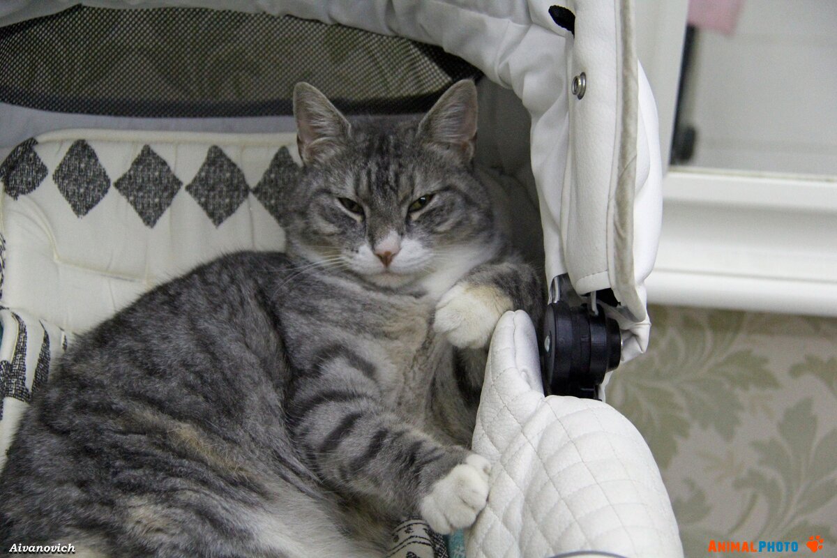 Домашние любимцы. Кошка Дуня в коляске внука.